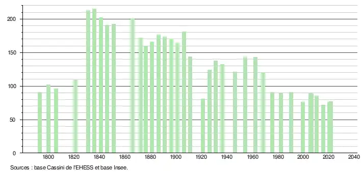 L'évolution du nombre d'habitants est connue à travers les recensements de la population effectués dans la commune depuis 1793. Pour les communes de moins de 10 000 habitants, une enquête de recensement portant sur toute la population est réalisée tous les cinq ans, les populations légales des années intermédiaires étant quant à elles estimées par interpolation ou extrapolation[17]. Pour la commune, le premier recensement exhaustif entrant dans le cadre du nouveau dispositif a été réalisé en 2005[18].