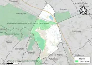 - les watergangs des Attaques et d'Andres et le lac d'Ardres. Cette ZNIEFF est marqué par la présence d’un réseau dense de fossés, mares et watergangs[23] ;