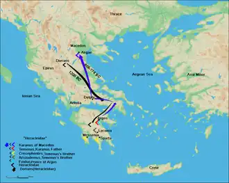 Une légende évoquée par Hérodote fait descendre les Argéades de Téménos, un descendant d'Héraclès originaire de la cité d'Argos[2]. Le royaume de Macédoine aurait été fondé en par le fils exilé de Téménos, Caranos, qui y aurait régné 28 ans, et auquel est attribuée la fondation d'Édessa et d'Aigai, première capitale de la Macédoine avant Pella. Toutefois d'après Plutarque[3], les Argéades seraient les héritiers d'Argaios, un roi macédonien. Les deux premiers siècles du royaume sont largement méconnus, l'histoire et la légende se mêlant à propos des cinq premiers rois argéades.