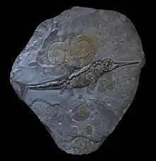 ![]() Fossile de Temnodontosaurus acutirostris parmi des ammonites Harpoceras falciferum, site d'Holzmaden, Jura souabe, 125 × 120 cm. | ||