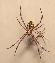 Argiope appensa ♀ (vue ventrale) et ♂ (vue dorsale) à droite