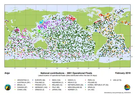 Lancé en 2000 par la Commission océanographique intergouvernementale de l’Unesco (COI) et l’Organisation météorologique mondiale (OMM), le programme Argo a pour objectif de développer un réseau global de 3 000 flotteurs profilants autonomes mesurant en temps réel la température et la salinité des 2 000 premiers mètres de l’océan[1]. Argo est un élément essentiel du système global d’observation des océans mis en place pour suivre, comprendre et prévoir le rôle des océans sur le climat de la planète. Fin 2007, le projet a atteint son objectif initial avec 3000 flotteurs en opération[1]. Argo est le fruit d’une coopération internationale remarquable et plus de 30 pays participent directement à la mise en place du réseau. Chaque année 800 à 900 de ces instruments sont mis à l'eau, soit le nombre nécessaire pour maintenir un réseau de 3000 flotteurs actifs compte tenu de leur durée de vie estimée à 4 ans. Argo est le premier réseau in-situ global d’observation des océans en temps réel. Avec les observations des satellites, les données des flotteurs Argo sont la principale source d'information pour les chercheurs s'intéressant au climat et à l'océan, pour la prévision saisonnière et climatique ainsi que pour les centres d'analyse et de prévision océanique. L’utilisation des données Argo conjointement aux mesures satellitaires a aussi permis des avancées remarquables dans la représentation de l’océan nécessaire à la prévision océanique et la prévision climatique saisonnière. Elles sont systématiquement utilisées par les systèmes d’océanographie opérationnelle (Mercator Ocean, Service Marin de Copernicus et son projet (MyOcean) et pour leurs applications.