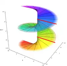 Représentation des valeurs possibles de l'argument, avec sa branche principale hachurée en rouge.