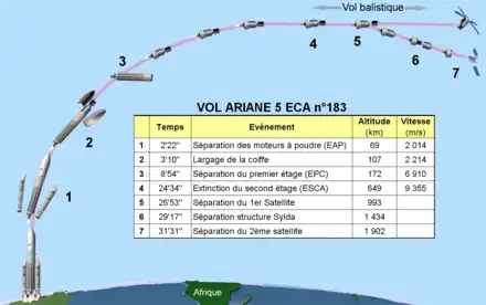 Ariane 5 est une fusée dont la hauteur est comprise entre 47 à 52 mètres avec sa charge utile et dont la masse s'élève à environ 777 tonnes au décollage. Le diamètre de la partie centrale (sans les propulseurs d'appoint) est de 5,40 m. Le lanceur comprend un étage cryogénique central, deux propulseurs d'appoint et un étage supérieur. L'étage cryogénique (EPC) emporte 220 tonnes d'ergols liquides (hydrogène et oxygène). Les deux propulseurs d'appoint (EAP) emportent 480 tonnes de poudre (propergol solide). Ils consomment deux tonnes de poudre par seconde pendant environ deux minutes. Le lanceur atteint une vitesse supérieure à 8 000 km/h deux minutes après le décollage. Pour les lancements à destination de l'orbite géostationnaire, la vitesse à la séparation de la charge utile est de 10 km/s. Pour les lancements à destination de l'orbite basse, la vitesse peut atteindre 17,3 km/s avec la version ECA[10].