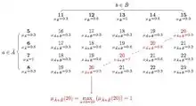 Pour calculer le degré d'appartenance de 18 à l'ensemble flou , il est nécessaire de construire tous les couples de valeurs tels que , et où . En effet, cinq couples voient leur somme égale à 18 et tous peuvent donc être à l'origine de ce résultat. De manière logique, on peut donc écrire :