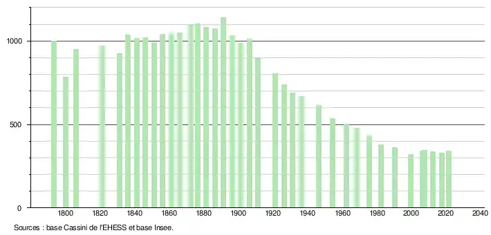 L'évolution du nombre d'habitants est connue à travers les recensements de la population effectués dans la commune depuis 1793. Pour les communes de moins de 10 000 habitants, une enquête de recensement portant sur toute la population est réalisée tous les cinq ans, les populations légales des années intermédiaires étant quant à elles estimées par interpolation ou extrapolation[18]. Pour la commune, le premier recensement exhaustif entrant dans le cadre du nouveau dispositif a été réalisé en 2007[19].