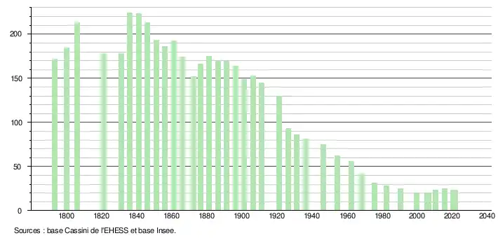 L'évolution du nombre d'habitants est connue à travers les recensements de la population effectués dans la commune depuis 1793. Pour les communes de moins de 10 000 habitants, une enquête de recensement portant sur toute la population est réalisée tous les cinq ans, les populations légales des années intermédiaires étant quant à elles estimées par interpolation ou extrapolation[25]. Pour la commune, le premier recensement exhaustif entrant dans le cadre du nouveau dispositif a été réalisé en 2005[26].