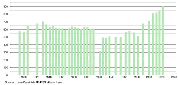 L'évolution du nombre d'habitants est connue à travers les recensements de la population effectués dans la commune depuis 1793. Pour les communes de moins de 10 000 habitants, une enquête de recensement portant sur toute la population est réalisée tous les cinq ans, les populations légales des années intermédiaires étant quant à elles estimées par interpolation ou extrapolation[23]. Pour la commune, le premier recensement exhaustif entrant dans le cadre du nouveau dispositif a été réalisé en 2006[24].