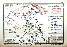 La progression de l'armée françaises est lente et cette dernière finit par être rattrapée par les troupes allemandes avant même d'avoir franchi la Meuse. Les Allemands, qui se dirigeaient vers Paris, ont deviné l'intention de Mac Mahon et ont obliqué dès le en direction du nord. Le 29, après un premier contact à Nouart avec le XIIe corps saxon, le 5e corps de de Failly bivouaque sans précaution à Beaumont. Aux alentours de midi et demi, le , les premiers obus s'abattent sur les campements[9]. Trois corps d'armées allemands vont fondre sur les troupes de Beaumont : le Ier corps bavarois à gauche, le IVe corps prussien au centre et le XIIe corps d'armée saxon à droite. Malgré la résistance de l'infanterie[10] et les reprises de combats à Mouzon, malgré une charge héroïque du 5e cuirassiers[11] le corps de de Failly est battu et doit retraiter sur Sedan.