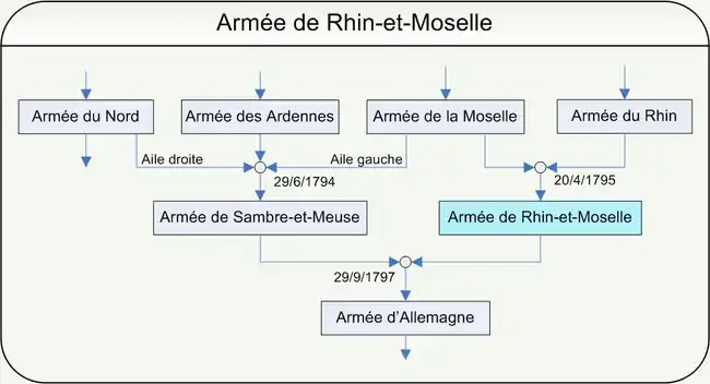 - Le décret du (13 ventôse an III) fusionne les armées du Rhin et de la Moselle sous l'appellation de l'armée de Rhin-et-Moselle. Ce décret arrive aux armées le , et, dès le lendemain, le général Michaud prend le titre de général commandant l'armée de Rhin-et-Moselle, de même que le général Kléber pendant son intérim ; mais aucun des deux ne modifie l'organisation des armées. Le général Pichegru, en passant devant Luxembourg, offre dès le une capitulation au général Blaise Colomban de Bender, mais ne prend le commandement en chef que le 17, à son arrivée au quartier général de l'armée du Rhin à Guntersblum. La réunion des deux armées et leur organisation en une seule ne sont réalisées que le par le général Pichegru, après que l'armée de Sambre-et-Meuse eut relevé celle de la Moselle devant Luxembourg, et de ce jour seulement commence vraiment l'existence de l'armée Rhin-et-Moselle.