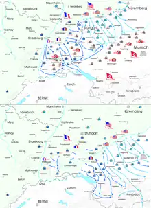 Une fois le franchissement fait, la première armée se distinguera lors de la traversée de la Forêt noire et des différents combats dans la Sarre. Le point d'orgue de la première armée sera la bataille du Nid d'aigle où la deuxième division blindée amenée par le général Leclerc prendra le second emplacement le plus important d'Allemagne après Berlin. La première armée, en plus d'envahir l'Allemagne, parviendra jusqu'en Autriche dans le Tyrol empêchant ainsi toute fuite allemande par la Suisse.