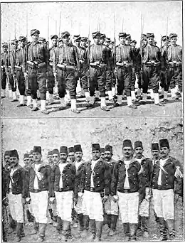 L'organisation militaire fixée par Hüseyin Avni Pacha, lui-même assassiné quelques jours après Abdülaziz, comporte un service militaire en plusieurs périodes : service actif (nizâm) de 4 ans pour les fantassins, 5 ans pour les cavaliers et artilleurs ; 2 ans de disponibilité (ichtiat), deux bans de redif de 3 ans chacun et 8 ans de mustahfiz. En temps de paix, l'armée compte environ 100 000 hommes, plus un effectif important de zaptiye (gendarmes) : le contingent annuel, qui était de 37 000 hommes, a été réduit à 11 000 en raison des difficultés budgétaires. En temps de guerre, en faisant appel aux réserves, l'armée peut rassembler entre 350 000 et 400 000 hommes, y compris les irréguliers (bachi-bouzouk) connus pour leur indiscipline et leurs exactions[18]. Elle se répartit entre 41 régiments turcs, 2 régiments bosniaques, 41 bataillons de chasseurs, 8 bataillons de garde-frontières, 26 régiments de cavalerie, 8 régiments d'artillerie de campagne (à 16 batteries de 6 pièces), 8 d'artillerie de forteresse, 2 du génie et 2 d'ouvriers d'administration[19].
