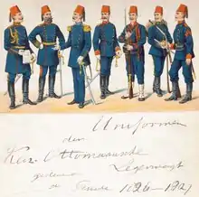 Un firman (édit) de 1843 instaure des commandements provinciaux avec cinq armées permanentes chargées de défendre Constantinople, la Thrace orientale (pachalik de Silistra), la Roumélie, l'Anatolie et les provinces arabes ; une sixième armée est créée en 1848 pour défendre la Mésopotamie (eyalet de Bagdad). En 1869, le service militaire est réorganisé en trois périodes : 4 ans de service actif (nizâmiye), 6 ans de réserve (redif) et 8 ans de garde territoriale (mustahfiz). Les sujets non musulmans en sont exemptés moyennant le paiement d'une taxe (bedel)[6].