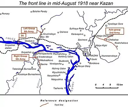 Lorsque les Komoutch se réunissent à Samara, il est décidé que le principal objectif stratégique est de capturer Saratov, mais Kappel pense que Kazan est une cible plus importante, et il l'attaque et la conquiert, défendue par une armée rouge nombreuse mais mal préparée.