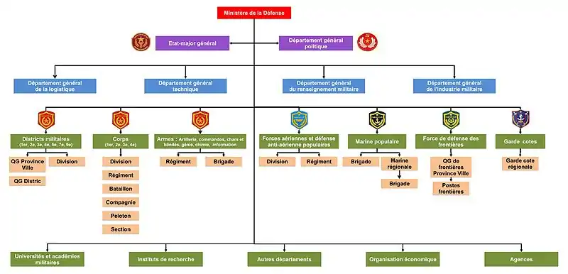 1. Les trois branches de l'Armée de Terre (vi) (les districts militaires, les corps d'armée et les unités armées spécialisées) n'ont pas un commandement central unique, mais sont placés directement sous l'autorité du ministère de la Défense qui commande l'État-Major général des armées de l'Armée populaire vietnamienne (vi)