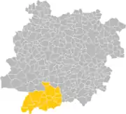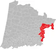Enfin celle du haut-armagnac couvre d'une part dans le Gers les cantons d'Auch-Nord-Ouest, d'Auch-Nord-Est, d'Auch-Sud-Ouest, d'Auch-Sud-Est-Seissan, de Jegun, de Lectoure, de Fleurance, de Marciac (la partie nord), de Mirande, de Montesquiou et de Plaisance, ainsi qu'une partie du canton de Riscle (Aurensan, Bernède, Corneillan, Labarthète, Lannux, Projan, Riscle, Saint-Mont, Ségos, Verlus et Viella)[6].