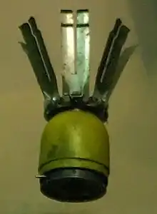 Une sous-munition BLU-3 américaine utilisée, entre autres, durant la guerre du Viêt Nam. Pesant 790 grammes, elle contient 180 g d’explosif et 200 granules en acier.