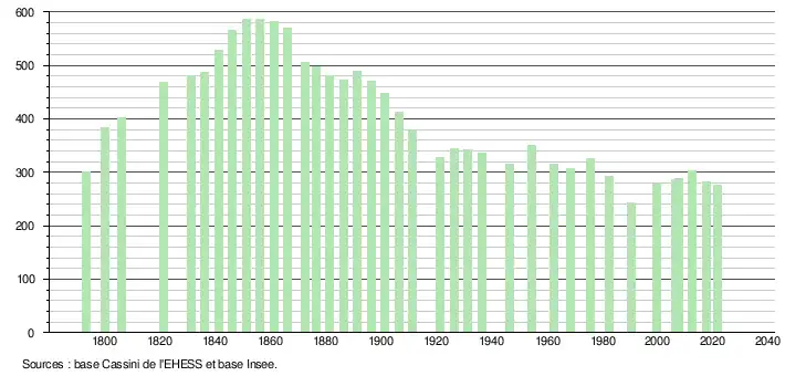 L'évolution du nombre d'habitants est connue à travers les recensements de la population effectués dans la commune depuis 1793. Pour les communes de moins de 10 000 habitants, une enquête de recensement portant sur toute la population est réalisée tous les cinq ans, les populations légales des années intermédiaires étant quant à elles estimées par interpolation ou extrapolation[25]. Pour la commune, le premier recensement exhaustif entrant dans le cadre du nouveau dispositif a été réalisé en 2007[26].