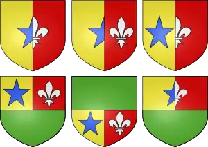 - « parti : d'or [...], et mi-parti de gueules [...] », ce qui est le blasonnement de référence.