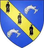 D'azur à la bande d'or chargée de trois moines encapuchonnés de sable posés à plomb, accompagnée de deux dauphins d'argent.