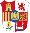 Ces armoiries comprennent plusieurs éléments séculaires : un blason composé de six parties, la couronne royale espagnole qui surmonte l'écu, et deux colonnes qui le flanquent de chaque côté, surmontées des couronnes royale (gauche - senestre héraldique) et impériale (droite - dextre héraldique). Le blason est constitué des blasons des royaumes historiques et de la dynastie régnante :