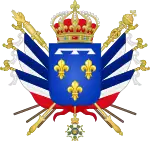 1830 – 1831L'écu ducal d'Orléans : d'azur aux trois fleurs-de-lis d'or, au lambel d'argent ; timbré de la couronne royale fleurdelisée fermée ; accompagné du cordon de l'ordre de la Légion d'honneur.Au début de la monarchie de Juillet, par l'ordonnance du , Louis-Philippe fixa les armes représentées sur le sceau de France : « à l'avenir le sceau de l'État représentera les armes d'Orléans surmontées de la couronne fermée, avec le sceptre et la main de justice en sautoir, et des drapeaux tricolores derrière l'écusson ».Officiel