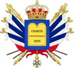 1831 – 1848L'écu est d'azur, à la charte constitutionnelle de 1830 d'or, gravée de sable ; timbré de la couronne royale fermée ; accompagné du cordon de l'ordre de la Légion d'honneur.En 1831, à la suite de mouvements de foules, il est décidé de remplacer l'écu d'Orléans, par un nouveau blason représentant la Charte constitutionnelle de 1830 : « à l'avenir, le sceau de l'État représentera un livre ouvert portant à l'intérieur ces mots « Charte constitutionnelle de 1830 », surmonté d'une couronne fermée, avec le sceptre et la main de justice en sautoir, et des drapeaux tricolores derrière l'écusson ».Officiel