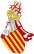 Raimond-Bérenger IV, comte de Barcelone et Alphonse II, roi d'Aragon, (1150 - 1177) : D'or à quatre pals de gueules à l'escarboucle pommetée à six rais d'or brochant sur le tout[1]. (Armes du comté de Barcelone devenues celles des rois d'Aragon après qu'Alphonse Ier, comte de Barcelone, devint roi d'Aragon). L'histoire de cet écu est la suivante: le roi se meurt lors d'une bataille à "déterminer". L'un de ses compagnons pose sa main sur son corps ensanglanté puis dépose quatre doigts de sa main sur son bouclier et trace quatre bandes rouge sang sur ce bouclier doré. |