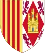 Jeanne Enríquez (1425 † 1468), consort de Jean II, roi d'Aragon. Parti en 1 d'or à quatre pals de gueules et en 2 de gueules à deux châteaux d'or ouvert et ajouré d'azur; à la pointe d'argent au lion de pourpre armé et lampassé d'or[12]. |