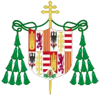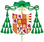 Alphonse (1470 † 1520), archevêque de Saragosse et vice-roi d'Aragon, fils illégitime de Ferdinand II, roi d'Aragon. Ancienne : parti en 1 de gueules au château d'or ouvert et ajouré d'azur et en 2 d'argent au lion de pourpre armé, lampassé et couronné d'or; à la pointe écartelé en sautoir d'or aux quatre pals de gueules et d'argent à l'aigle de sable[33]. |