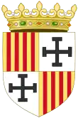 Jean Raimond IV Folch (1446 † 1513), comte après duc de Cardona comte de Prades, baron d'Entença et premier marquis de Pallars Sobirá, fils de Jeanne d'Urgell (1405 † 1455), comtesse d'Urgell, arrière-petit-fils de l'infant Jacques d'Aragon (1320 † 1447), Jacques Ier, comte d'Urgell. Ancienne : écartelé en sautoir : I et IV, d'or à quatre pals de gueules; II de gueules à trois chadrons d'or et IV, semé de fleurs de lys d'or; un lambel de gueules, brochant sur la partition[19]. Moderne : Parti, en I, écartelé en sautoir: au A et D d'or à quatre pals de gueules, au B d'azur semé de fleurs de lys d'or au lambel de gueules brochant, au C de gueules à trois chardons d'or; en II, écartelé en sautoir: aux A et D d'or à quatre pals de gueules, aux B et C échiqueté d'or et de sable[19]. |
