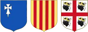 Écartelé en sautoir : I et IV, d'or à quatre pals de gueules; II et III, semé de fleurs de lys d'or; un lambel de gueules, brochant sur la partition[20],[19], portées ensuite par :
