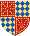 Jeanne de France (1343 † 1373), consort de Charles II, roi de Navarre. Parti, en 1 de gueules aux chaînes d'or posées en orle, en croix et en sautoir, chargées en cœur d'une émeraude au nature et en 2 coupé d'azur semé de fleurs de lys d'or à la bande componée d'argent et de gueules et d'azur semé de fleurs de lys d'or[1]. |