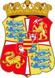 Ecartelé: en I et IV, d'or, à trois cœurs de gueules, posés en un pal, à un lion léopardés d'azur, armés et lampassés de gueules, couronnés du champ, brochant sur-le-tout (de Danemark) en II et III de gueles au château d'argent au centre des Tours d'une rose de argent; sur-le-tout-du-tout d'or à deux fasces de gueules (de Oldenbourg)