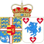 Ecartelé : en 1 et 4, d'or, à neuf cœurs de gueules, posés en trois pals, à trois lions léopardés d'azur, armés et lampassés de gueules, couronnés du champ, brochant sur-le-tout (Danemark) en 2 et 3 de gueules, au lion rampant d'or surmonté de trois étoiles du même rangées en chef (Monpezat). |