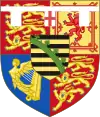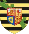 Écartelé : I et IV de gueules à trois léopards d'or armés et lampassés d'azur (d'Angleterre) ; II d'or, au lion de gueules, au double trescheur fleuronné et contre-fleuronné du même (d'Écosse) ; III d'azur, à la harpe d'or, cordée d'argent (d'Irlande) ; au lambel à trois pendants d'argent brochant, celui en cœur chargé d'une rose de gueules (dite de Saint Georges), les deux autres chargés d'une moucheture d'hermine de sable ; sur-le-tout burelé de dix pièces de sable et d'or au crancelin de sinople, brochant en bande sur le tout (de Saxe)[13]. |