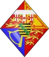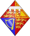 Écartelé : I et IV de gueules à trois léopards d'or armés et lampassés d'azur (d'Angleterre) ; II d'or, au lion de gueules, au double trescheur fleuronné et contre-fleuronné du même (d'Écosse) ; III d'azur, à la harpe d'or, cordée d'argent (d'Irlande) ; au lambel à trois pendants d'argent brochant, celui en cœur chargé d'un chardon au naturel, ceux à dextre et sénestre chargés d'une rose Tudor[13]. |