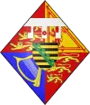 Écartelé : I et IV de gueules à trois léopards d'or armés et lampassés d'azur (d'Angleterre) ; II d'or, au lion de gueules, au double trescheur fleuronné et contre-fleuronné du même (d'Écosse) ; III d'azur, à la harpe d'or, cordée d'argent (d'Irlande) ; au lambel à cinq pendants d'argent brochant, celui en cœur chargé d'une croix de gueules (dite de Saint Georges), ceux à dextre et sénestre chargés d'une fleur-de-lys d'azur, les autres chargés d'un trèfles de sinople ; sur-le-tout burelé de dix pièces de sable et d'or au crancelin de sinople, brochant en bande sur le tout (de Saxe)[13]. Écartelé : I et IV de gueules à trois léopards d'or armés et lampassés d'azur (d'Angleterre) ; II d'or, au lion de gueules, au double trescheur fleuronné et contre-fleuronné du même (d'Écosse) ; III d'azur, à la harpe d'or, cordée d'argent (d'Irlande) ; au lambel à cinq pendants d'argent brochant, ceux en cœur, à dextre et sénestre chargés d'une croix de gueules (dite de Saint Georges), les autres chargés d'une fleur-de-lys d'azur ; sur-le-tout burelé de dix pièces de sable et d'or au crancelin de sinople, brochant en bande sur le tout (de Saxe)[13].