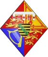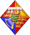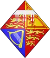 Écartelé : I et IV de gueules à trois léopards d'or armés et lampassés d'azur (d'Angleterre) ; II d'or, au lion de gueules, au double trescheur fleuronné et contre-fleuronné du même (d'Écosse) ; III d'azur, à la harpe d'or, cordée d'argent (d'Irlande) ; au lambel à cinq pendants d'argent brochant, ceux en cœur, à dextre et sénestre chargés d'une croix de gueules (dite « de Saint Georges »), les autres chargés d'un léopard de gueules[13],[14]. Écartelé : I et IV de gueules à trois léopards d'or armés et lampassés d'azur (d'Angleterre) ; II d'or, au lion de gueules, au double trescheur fleuronné et contre-fleuronné du même (d'Écosse) ; III d'azur, à la harpe d'or, cordée d'argent (d'Irlande) ; au lambel à trois pendants d'argent brochant, chacun chargé d'une ancre d'azur[13].