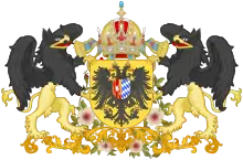 parti de sable au lion d'or contourné armé, couronné et lampassé de gueules (Palatinat du Rhin, contourné) et fuselé en bande d'azur et d'or (Wittelsbach), enté en pointe de gueules à l'orbe crucifère d'or (dignité d'archisénéchal d'Empire)[9]. |