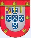 écartelé, au I et IV d'argent, à cinq écussons d'azur, posés en croix, les deux de flanc mis de côté, chaque écusson chargé de cinq besants du champ, posés en sautoir, à la bordure de gueules, chargée de douze châteaux d'or, donjonnés de trois tours, ouverts et ajourés d'azur, aux quatre fleurs de lys de sinople, brisé d'un lambel d'argent, chaque pendant chargé de trois mouchetures d'hermine (qui est d'Aviz-Coimbra), et au II et III d'or à 4 pals de gueules (qui est d'Aragon). |