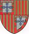 Jean Ier de Portugal, portés ensuite par les rois de Portugal qui lui succèdent jusqu'à Jean II. d'argent aux cinq écussons d'azur disposés en croix, l'écussons latérales couchés, chaque écusson chargé de cinq besants d'argent disposés en sautoir, à la bordure de gueules chargée de douze châteaux d'or, donjonnés de trois tours, ouverts et ajourés d'azur et chargé des quatre bouts évidents d'une croix fleurdelisé de sinople[1],[2]. |
