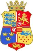 Écartelé : à la croix pattée d'or, qui est la Croix de Saint Éric, cantonnée en 1 et 4, d'azur, à trois couronnes d'or (de Suède moderne), en 2 et 3, d'azur, à trois barres ondées d'argent, au lion couronné d'or, brochant sur le tout (de Suède ancien) ; sur-le-tout écartelé : 1, de gueules, au lion couronné d'or, tenant dans ses pattes une hache danoise d'argent, emmanchée du second (de Norvège ancien) ; 2, d'or, à deux lions léopardés d'azur, armés et lampassés de gueules (de Schleswig) ; 3, de gueules, à la feuille d'ortie d'argent (de Holstein) ; 4, de gueules, au cygne d'argent, becqué, membré et colleté d'une couronne d'or (de Stormarn ; enté en pointe de gueules, au cavalier armé d'argent (de Dithmarse) ; sur-le-tout-du-tout, écartelé d'or à deux fasces de gueules (de Oldenbourg) et d'azur, à la croix pattée, au pied fiché d'or (de Delmenhorst). |