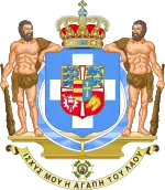 D'azur, à la croix alésée d'argent (de Grèce), sur-le-tout d'or, à neuf cœurs de gueules, posés en trois pals, à trois lions léopardés d'azur, armés et lampassés de gueules, couronnés du champ, brochant sur-le-tout (de Danemark), avec un lambel d'argent