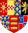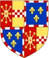 Coupé en 1, parti en 1 de gueules, à l'écusson d'argent, aux rais d'escarboucle d'or, brochantes sur le tout, et en 2 d'or, à la fasce échiquetée d'argent et de gueules de trois tires et en 2 d'azur semé de fleurs de lys d'or à la bordure componée d'argent et de gueules[source insuffisante],[8]. |