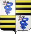 (fr) Écartelé, au premier et au quatrième d'argent au serpent d'azur ondoyant en pal couronné d'or engloutissant un enfant de carnation, au deuxième et au troisième fascé d'or et de sable