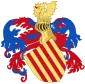 Raimond-Bérenger IV, comte de Barcelone et Alphonse II, roi d'Aragon, (1150 - 1177) : D'or à quatre pals de gueules à l'escarboucle pommetée à six rais d'or brochant sur le tout[1]. (Armes du comté de Barcelone devenues celles des rois d'Aragon après qu'Alphonse Ier, comte de Barcelone, devint roi d'Aragon). L'histoire de cet écu est la suivante: le roi se meurt lors d'une bataille à "déterminer". L'un de ses compagnons pose sa main sur son corps ensanglanté puis dépose quatre doigts de sa main sur son bouclier et trace quatre bandes rouge sang sur ce bouclier doré. |