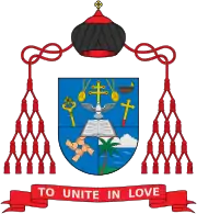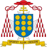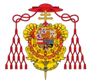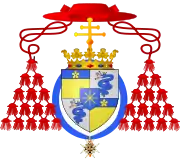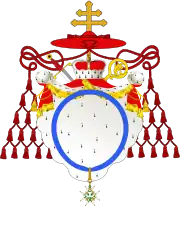 Cardinal grand-maître de l'ordre équestre du Saint-Sépulcre de Jérusalem | Le cardinal grand-maître de l'ordre du Saint-Sépulcre de Jérusalem écartèle ses armes avec celles de l'ordre, d'argent à la croix de Jérusalem de gueules. Il le timbre du chapeau héraldique de gueules à 5 rangées de houppes et cordons de même. Le tout posé sur un manteau mouvant de la couronne d'épine surmontée du cimier. L'écu est entouré du collier de l'ordre[2]. |