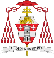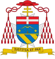 Cardinal, archevêque métropolitain | Les cardinaux qui sont archevêques métropolitains peuvent orner leurs armes du pallium, qu'ils placent alors en pointe de l'écu ou -plus rarement- le sommant[1]. |