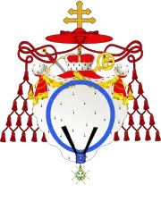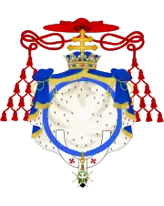 Cardinal-évêque (ou plus généralement cardinaux qui sont évêques) | Les cardinaux qui sont évêques ajoutent une croix de procession d'or derrière leur écu[1].